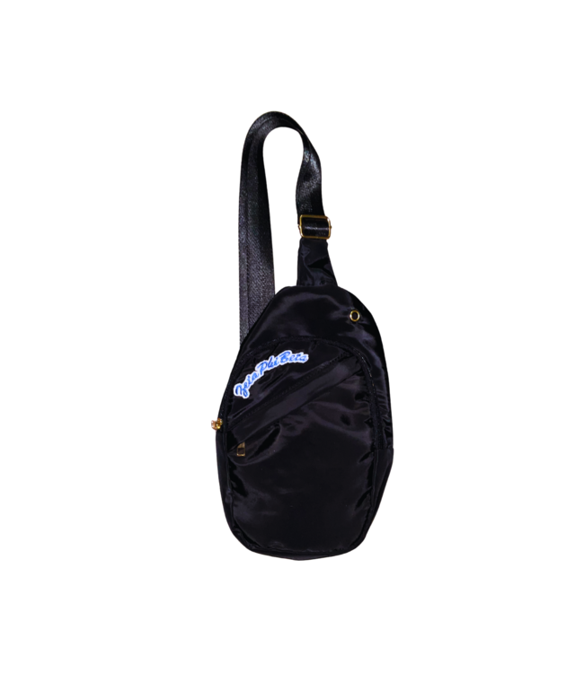 Black nylon crossbody with vertical zip front pocket. Perfect for games, shopping and chilling. Adorned with Zeta Phi Beta Patch.