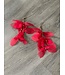 Elegant red featherweight pierced earrings with gold studs and chain.