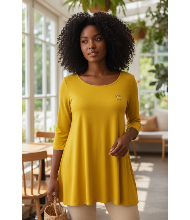 Lightweight jersey knit sweeps across a rounded neckline and falls to fitted three-quarter sleeves. Comfy swing silhouette flares gently to a perfect finish. Hidden side seam pockets.